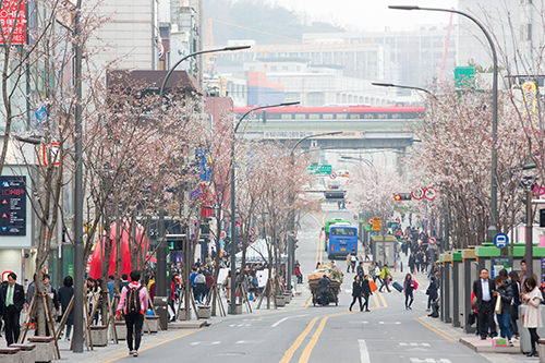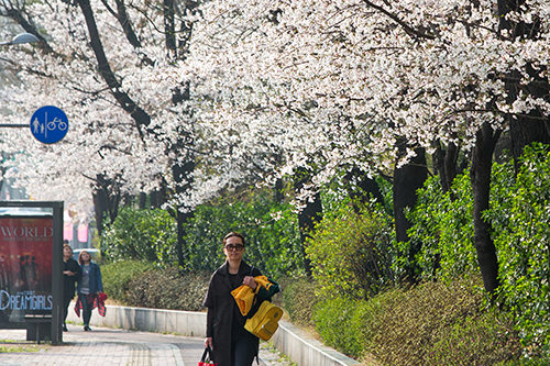 在韩国大学环绕的新村也是一片春意盎然。从新村站到延世大学的大道两旁,樱花已经开始绽放。估计本周末,这里的樱花将盛开,届时将是一片如霞似云的绯红。