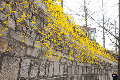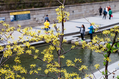 可爱娇小的山茱萸在首尔市中心的清溪川旁展露出天真的笑脸。听着淙淙流水,沿着清溪川一直走,一路上有高洁的梅花、艳丽的金达莱等春花相伴,实在是一场视觉盛宴。