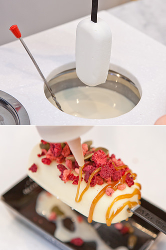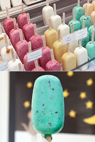 弘大附近的“ma creme”因韩国的美食栏目《Tasty Road》而有名起来,这里最大的特色就是能够根据顾客的喜好制作专属于自己的冰棍儿。首先在牛奶、巧克力、绿茶三种口味中选择一款冰淇淋,然后选择浸泡在白巧克力里还是黑巧克力里,最后在25种浇头上选择6种撒上即可,味道非常丰富,基本价格4,900韩元。