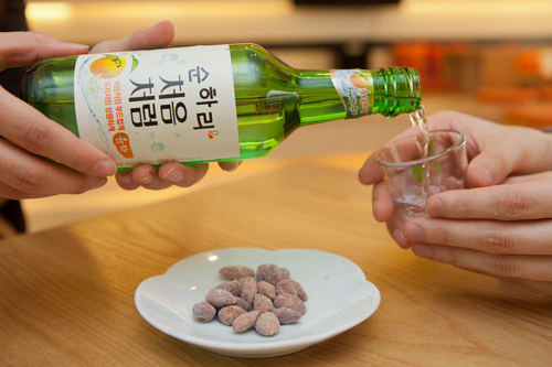 上个月,与真露并为韩国烧酒界两大巨头的乐天酒业推出了“柔和初饮初乐”柚子烧酒。这一款烧酒的酒精浓度为14度,比以前一般口味的“初饮初乐”低4度,被叫作“柔和初饮初乐”。