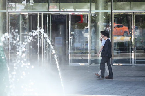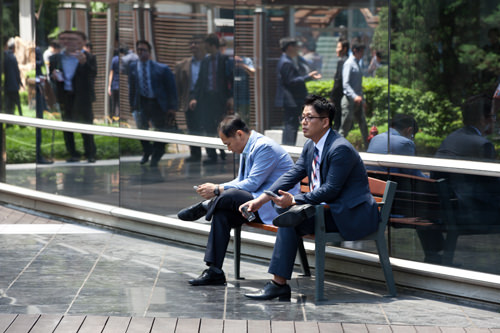 坐在长椅上休息的西装男正在外勤中吧?在讲究礼仪的韩国,即使是大热天也要西装革履。尤其是商务人士,领带与西装是必不可少的装备。韩国今年的夏天来得格外早,虽然还不到6月,首尔天气最高气温已经高达30度,外出的职场人看起来实在辛苦。