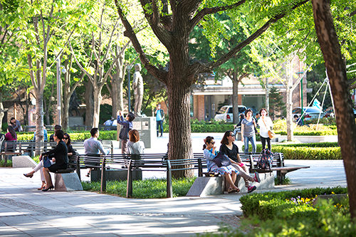 大学路的地标“马罗尼埃公园”一到周末还能看到许多很棒的街头表演。很多人会从这里散步至附近的梨花壁画村和可以一览首尔夜景的骆山公园。