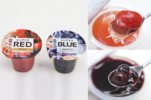 韩国最大的食品公司CJ第一制糖旗下的甜点品牌“Petitzel”推出了“SUPER RED”和“SUPER BLUE”布丁(2,000韩元/个)。布丁原料是超级食物搜索关键词排行榜位列前茅的西红柿和蓝莓,整块果肉被放进布丁里非常诱人。