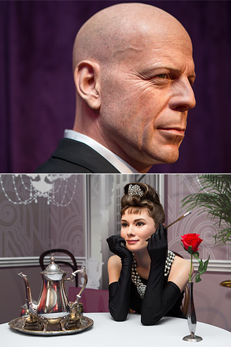 栩栩如生的蜡像逼真得让人不敢靠近。制作一个蜡像需要20位艺术家历经3个月,完成将近250多道工序才能大功告成。从头发到表情,甚至突出的血管都力求与真人相似传神。