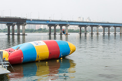 香蕉船或摩托艇都是水上运动不可缺少的项目。而在韩国,还有一种更受人们欢迎的水上运动,就是从高处跳到巨大的充气船上的“汽船跳”(上图)。现在在汉江可以以每次1,000韩元的超低价尽情体验哦(在汉江汝矣岛地区,截至23日)!