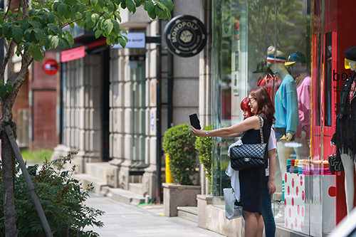 这条街上汇聚着许多外观独特、时尚满分的店铺。不少年轻女子在购物之余,三三两两在街边小店前自拍留影。