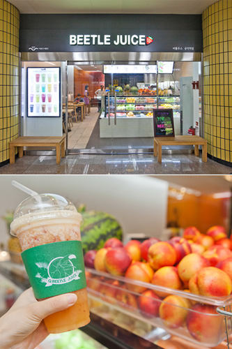 “BEETLE JUICE”不仅有苹果、西瓜等常见的水果,还有牛油果等稀有水果,而且可以自由搭配(不超过2种)。这里的鲜榨果汁都是大杯,和星巴克大杯一样为600毫升,价格从3,900韩元起。在机场铁路A’REX换乘站孔德站里面就有一家分店。