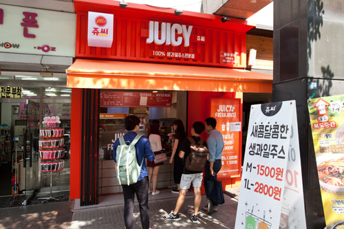 鲜榨果汁专卖店“JUICY”的果汁有M和L两种大小,单一果汁价格从1,500韩元起,搭配2种水果的果汁从2,000韩元起。近日“JUICY”的门店如雨后春笋般在首尔大街小巷涌现,弘大地区已经开有2个门店,常常大排长龙。