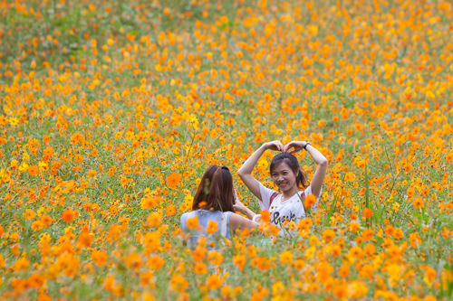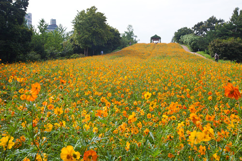 秋色在不知不觉中漫延开来,最近韩国天气预报节目的背景都是那铺天盖地的金黄大波斯菊,让人看着不禁心生向往。这片金黄的花田位于首尔市松坡区的奥林匹克公园内。
