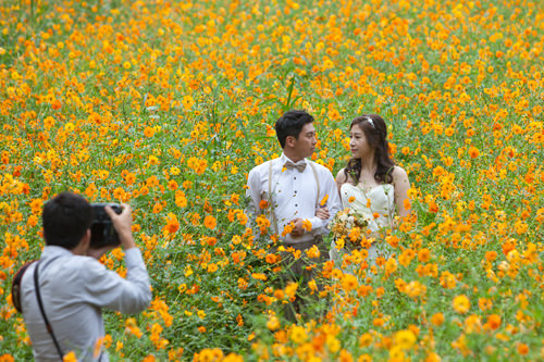 在美丽的花海中遇到美丽的新人,繁花满园与幸福齐肩,好唯美浪漫的画面。韩国最近的婚纱摄影流行“自助拍摄”,约一位摄影师到户外,拍出只属于自己的风格。
