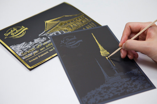 这一套(12,000韩元)里有4张明信片大小的画纸,其中有N首尔塔、崇礼门等首尔观光名所。刮画是一个不用动脑筋的简单操作,当你集中精神刮画时能够暂时忘记工作生活上的烦恼。因此刮画本很适合减压,最近常常售罄。