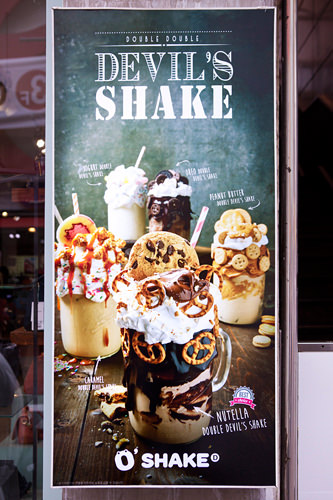 澳洲出名的巨型甜腻恶魔杯——“O'SHAKE”,在梨泰院引起热潮后,于9月9日在明洞开起了分店。主打的五款“恶魔饮料”造型十分抢眼,每一杯的基本热量都超过1000大卡!其中最受欢迎的是洒满巧克力、椒盐蝴蝶饼、曲奇、奶昔的“nutella巧克力酱杯”(8,500韩元),还有奥利奥杯、黄油花生酱杯、酸奶杯、焦糖杯等。