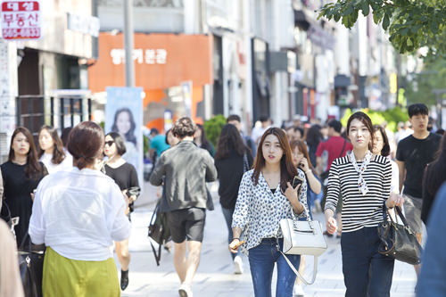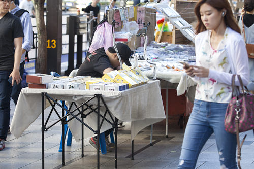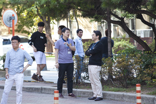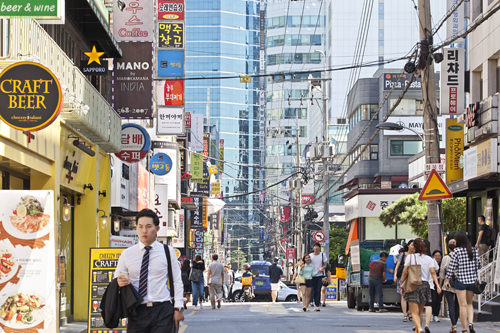 江南还是首尔知名企业聚集的高级商业区,林立的写字楼大厦间,可以看到趁中午休息时间出来抽根烟、放松放松的白领们。