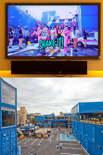 由200个蓝色集装箱组合而成的时尚购物中心COMMON GROUND位于建国大学附近。它不仅因入驻的人气店铺而闻名,其帅气、与众不同的设计更吸引了很多年轻人前来。SISTAR在今年夏季推出的新曲《SHAKE IT》的整首MV几乎都在这里拍摄。