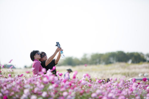 紫芒田边盛开着大片的波斯菊!人们正在美丽的波斯菊花丛中忙着拍照留念。