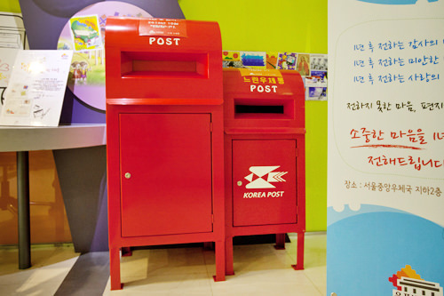 从首尔中央邮局的外侧沿着楼梯下楼,能够到达邮票博物馆入口。邮票博物馆不仅供游客免费参观(每周一、周末及韩国法定节假日休息),今年还新增了能够给参观者带去难忘回忆的小邮筒,很多人都是冲着它而来的哦。