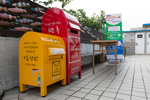 除了明洞,可以俯瞰首尔全景的北岳Skyway、《我们结婚吧》中泰民、孙娜恩的约会地栗洞自然公园和釜山甘川文化村内(如图)等其他地方也有一年后可以收到的慢递邮筒。想在韩国之行中制造些浪漫,就给一年后的自己或家人朋友写一封信吧!