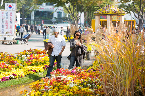 最近,首尔广场变成了花的海洋,五颜六色争相斗艳的菊花将广场装扮得格外美丽,吸引了许多游人驻足观赏。