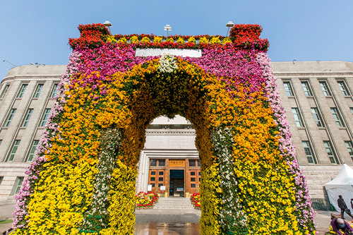 原来这是首尔市政府举办的“2015首尔菊花展”,菊花是特地从全罗南道咸平郡运来的。其中最显眼的是为了纪念韩国光复70周年而设置的高达7米的“菊花独立门”。