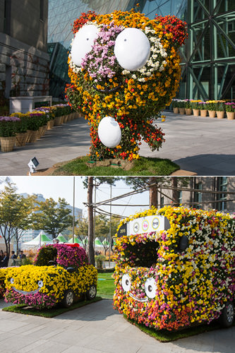 用五彩的菊花打造成的各种卡通人物深受小朋友们的喜爱,有首尔市的吉祥宝“王虎”、超人气小巴士Tayo、可爱虫虫Larva等等。