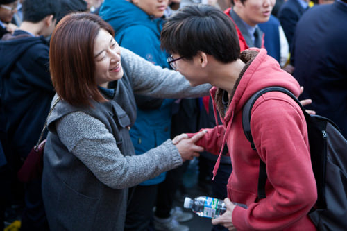 与中国高考考场前的情景一样,父母和亲戚们都来为考生们助威加油。考生们在家人深深的祝福中走进考场。