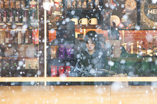 雪下得时大时小,气温却非常低,这时候躲进暖融融的咖啡厅欣赏雪景也很不错。