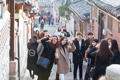 首尔从昨日开始气温再次骤降,可严寒的冷空气并没有影响人们外出游玩的热情。我们来到人气观光景点三清洞及北村韩屋村,这古今风韵并存的街区依然那么热闹。