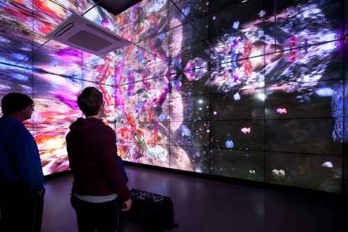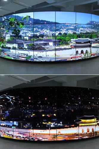 进入1层内部,可以看到宽15米、高3米的弧形OLED媒体墙,这里循环播放着光化门、景福宫一带春夏秋冬不同的风景。