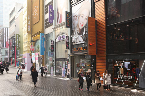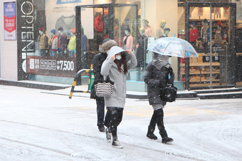 在明洞这个购物圣地,严寒的天气加大雪依然阻挡不了人们血拼的热情。特别是外来的游客们,在大雪中拎着大包小包小心翼翼地走着。