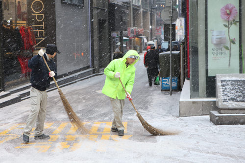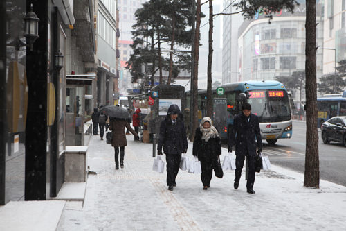 今天从一大早,首尔的天空就开始飘起纷纷扬扬的雪。不多久,地面就被白雪覆盖,人们都把自己裹得严严实实,有的戴起连衣帽、有的撑起伞来防雪。