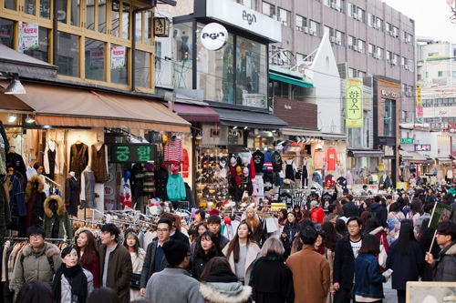 弘大深受国内外年轻人青睐的原因之一,是因为这里拥有很多款式时尚、价廉物美的服饰小卖店。一年四季不论什么时候,这里总是一派熙熙攘攘的景象。