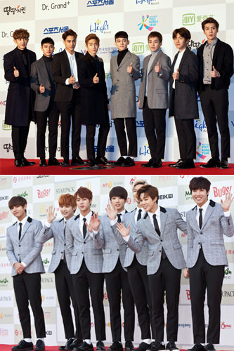 韩国最佳歌手的冠军为男团BIGBANG。上一年排在第一的EXO(图上),今年则被选为第三。人气一直飙升的防弹少年团(BTS,图下)在最佳歌手领域夺得亚军的名誉。