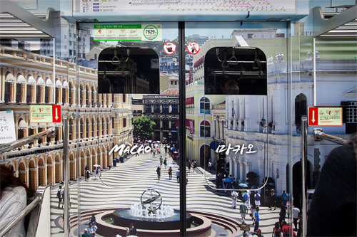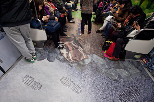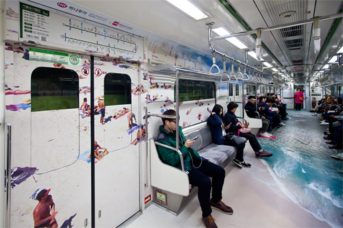 心动了吗?原来它是韩国一家旅游公司与首尔地铁合作推出的旅游广告,贴满车厢的3D图案将著名旅游地活灵活现地展示在人们眼前。