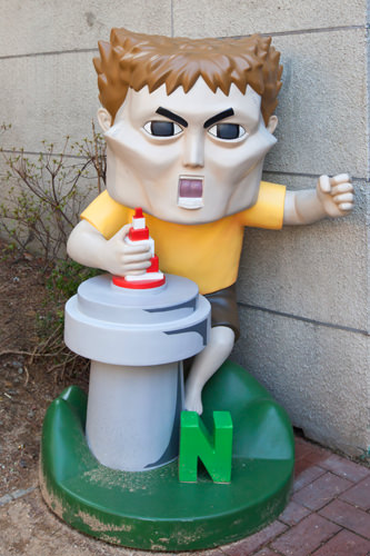 这座滑稽的漫画像是否看着很眼熟?对韩国漫画有一点了解的人可能都读过人气漫画作家赵石的《心灵的声音》。这部漫画中出现的作家同名主人公就在“漫画工作所”的入口处,手拿N首尔塔用夸张的表情迎接来访的人!