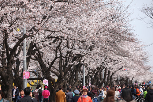 汝矣岛的樱花闻名遐迩,是春天来韩国旅游时必看的美景!这里栽植的樱花有1,800多株,树龄为30~35年。行走在轮中路上,樱花交织成一道绯红穹窿,如云似雾,格外浪漫梦幻。