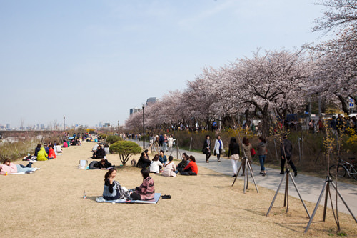 在汉江边找一块安静的空地,铺上坐席,一边欣赏着樱花一边谈笑风生的人们不在少数。这几日首尔的平均气温都在15度左右,樱花开了8成,估计本周末将迎来樱花怒放的身姿。