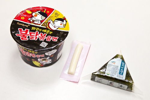 韩国MBC电视台播出的娱乐节目《我独自生活》中,李成宰将韩国便利店出售的火辣鸡炒面、条形奶酪和金枪鱼三角紫菜包饭(左起)搭配食用,竟出现了出人意料的美味!自此,美食的“黄金混搭”成为人们竞相追逐和尝试的潮流吃法。