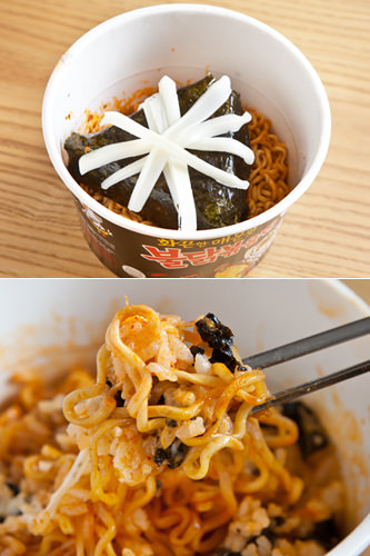 先将吃掉火辣鸡炒面1/3,再把金枪鱼三角紫菜包饭和撕开的条形奶酪放在剩余的方便面上,放入微波炉加热至奶酪融化变软。方便面的香辣搭配奶酪的香浓,再与金枪鱼三角紫菜包饭的咸鲜味融合,绝妙的味道让你回味无穷!
