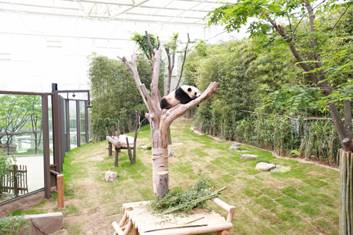 爱宝、乐宝在竹林中被分开来饲养。在安逸的环境下他们正在懒洋洋地躺着晒太阳。来到韩国后他们都胖了不少,看来适应得都不错。