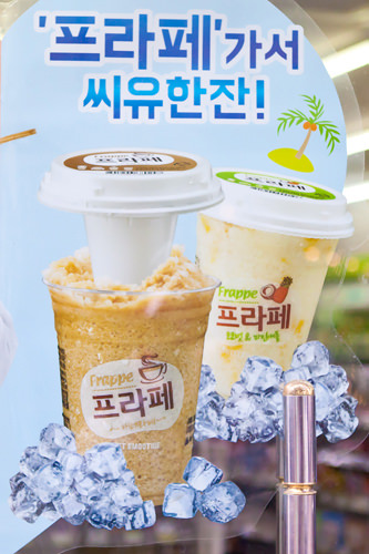 CU便利店则开始销售消夏解暑的“Frappe雪泥(2,000韩元)”。先加入少量热水,使冰冻雪泥融化,搅拌饮用的方法也是独树一帜。韩国旅行途中,在便利店小憩,顺便品尝一下便利店独有的美味也不错哦!