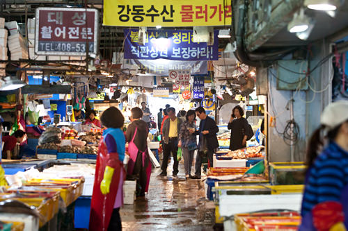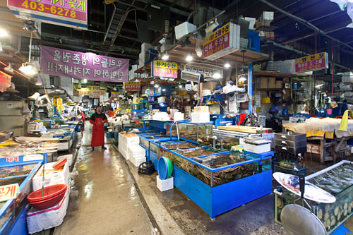 作为韩国最大的农水产品批发市场,这里一天到晚都是一派繁忙景象。丰富新鲜的海产,便宜的价格,可以现场品尝生鱼片、大龙虾等美食,是可乐市场的三大优势。