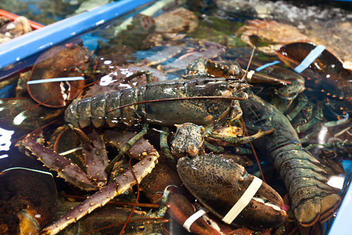 市场里咸咸的海水气息扑鼻而来,大龙虾、海螺、蛤蜊、鲅鱼、青花鱼、螃蟹等等,海产丰富应有尽有!除此以外,在水产市场还有卖小干鱼和鱿鱼、海苔等干菜和明太子等副食类产品的地方。