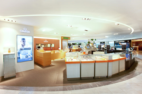 这里有"劳力士(ROLEX)"、"欧米茄(OMEGA)"等品牌的精选手表、饰品精品店。太阳镜专区里"香奈儿"、"古驰"等国际名品也一应俱全。