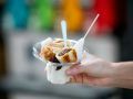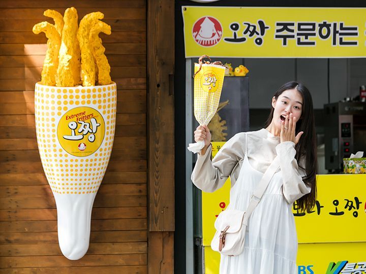 在全州韩屋村的热门主街上,「鱿赞」是一家人气极高的轻食店。其主打整只炸鱿鱼,分量十足,同时凭借震撼的视觉效果在韩国社交媒体上迅速走红。炸鱿鱼远看如花束般的包装别具特色,提供甜洋葱、香辣与芝士三种口味,咸香适中,非常适合搭配清爽饮品一同享用。店铺毗邻烤串与软冰淇淋店,门前总是人头攒动,周末更是热闹非凡。