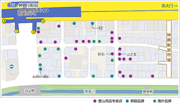 韩国品牌及外国品牌的登山用品店分布在钟路5街的5号出口及6号出口之间的大街及平和市场对面的清溪川沿岸上,过去传承下来的小店则集中在巷子里。 |