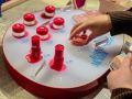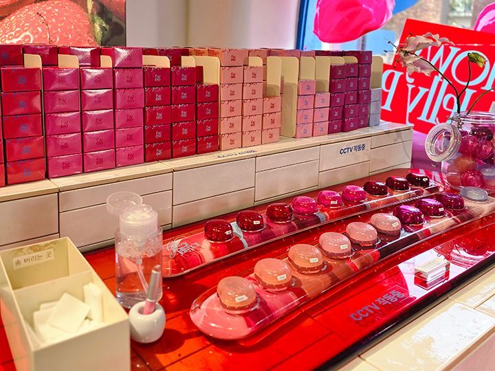 店内主打产品是色彩鲜艳的圆形胶囊系列,包括唇颊两用膏、气垫粉底和光泽唇彩等明星产品。品牌以丰富的色号选择著称,顾客可参考30种颜色的官方色卡进行挑选。此外,现场定制填充的钥匙扣服务也深受粉丝喜爱,为购物增添独特趣味。