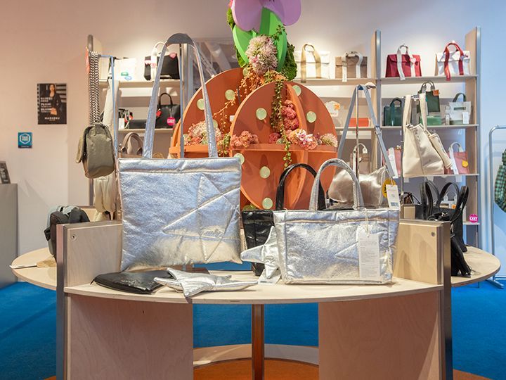 这家旗舰店是韩国的人气包袋品牌「MARHEN.J」在圣水洞的门店。步入店内首先映入眼帘的便是标志性的大型红色手提包装置,空间横跨三层,开阔而明亮。产品线从休闲托特包到皮革包款一应俱全,种类极为丰富。还可选用韩文字母贴章进行个性化装饰,可作包挂使用的小收纳袋也颇受欢迎。品牌积极践行环保,采用植物基“苹果皮革”及再生尼龙等创新材质打造的商品,兼具时尚美感与可持续理念。
