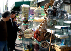 部分店铺还出售观赏鱼和养鱼用具。在这里,您可以看到各种各样的鱼,当然主要是以淡水观赏鱼为主。除了海水鱼,还有金鱼和鲤鱼等东亚地区常见的观赏鱼。古比鱼的售价为700~1,000韩元,热带鱼为8,000韩元。 |