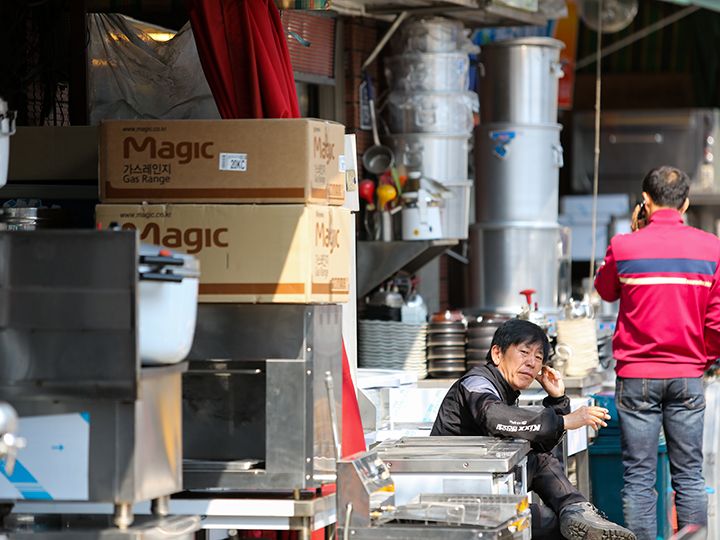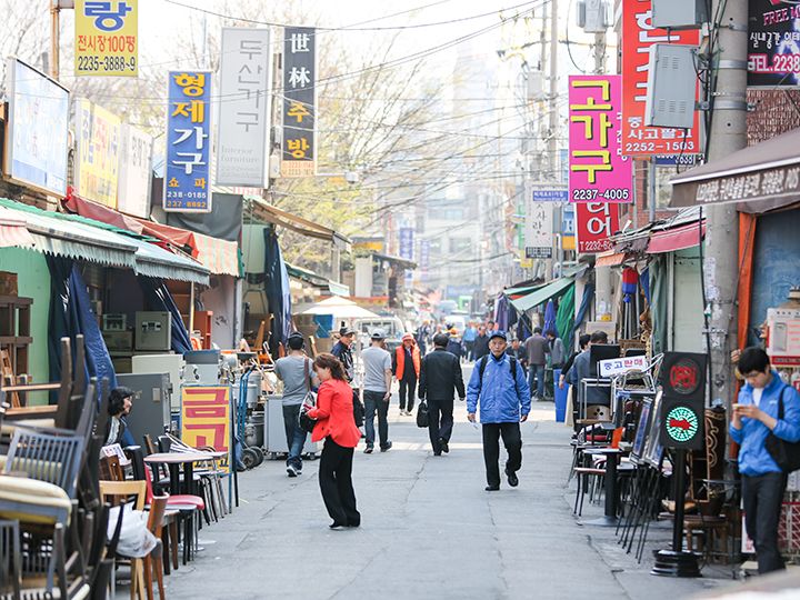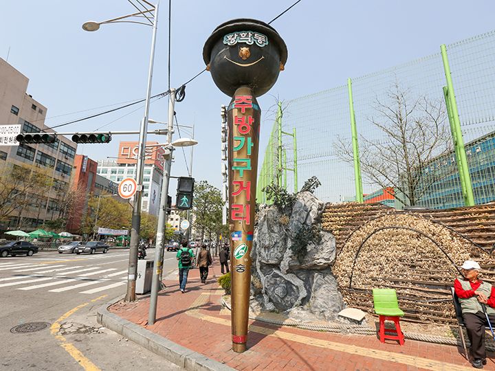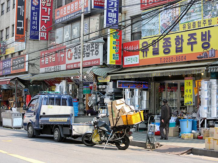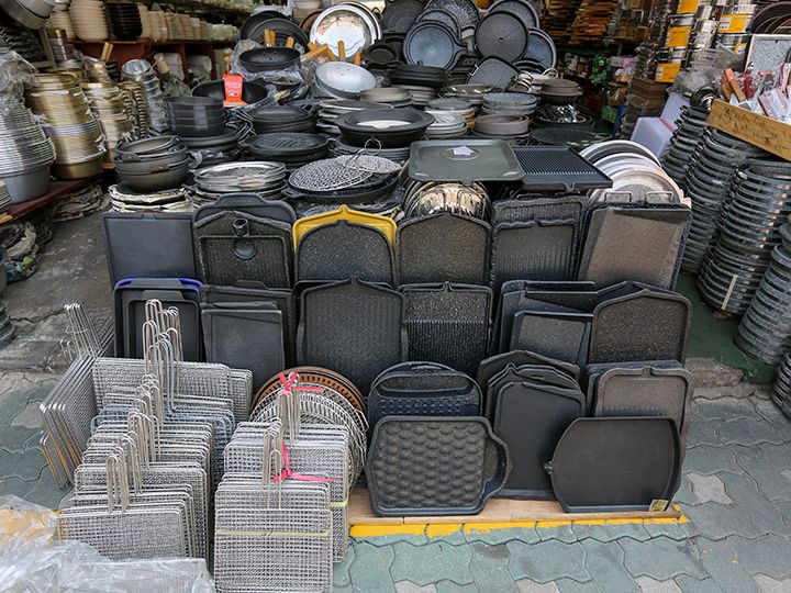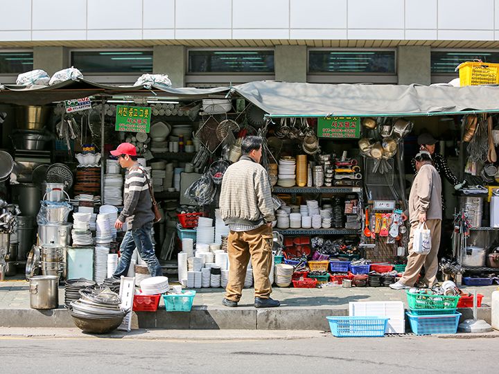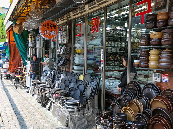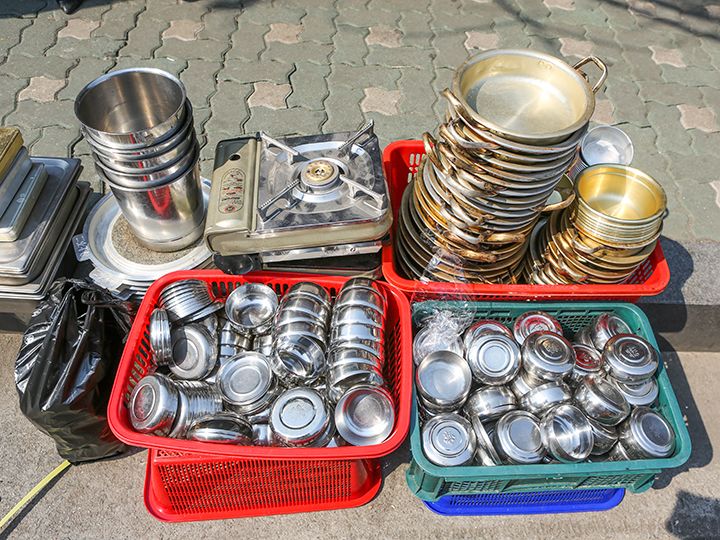 街上还有好几家店铺是仅用一层塑料膜架起的棚子当店面的。它们以超低价出售过时的商品或是清仓处理的商品。在这里,您可以看到还残存有烧焦的痕迹的旧锅具、满是岁月痕迹的不锈钢饭煲等等。带把手的盛韩国米酒用的碗,才1,000韩元就能买到哦!或许您还能淘到一些别具风情的珍贵宝物。总之,一定会有新发现哦!