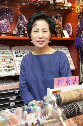 能量石因具有神秘力量和柔和色泽而拥有超高人气,并且能从一定程度上提升身体力量,增添好运,具有使内心安宁镇定的效果。“小玉的水晶社”位于明洞小公地下商品街,是一家经营了36年的老店。店内主要出售诞生石原创手链、能量石饰品等。店铺社长小玉老师是能量石方面的专家,只要让她了解了您的生辰八字、面相、愿望等,凭借多年的经验及专业知识,她能很快很准确地判断出每位客人需要哪种能量石,并从100多种石头中挑选出来。店内既有成品能量石手链,也可根据您的情况制作半定制式手链。